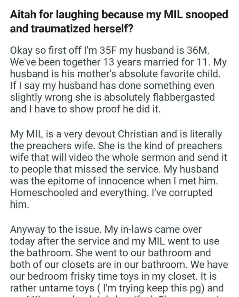 And this isn’t just any MIL. Oh no. This MIL is a “very devout Christian” and is literally the preacher’s wife. The kind who videos the sermon and sends it to you if you miss a Sunday. Her “golden child” son was the “epitome of innocence” when they met. Homeschooled and everything.