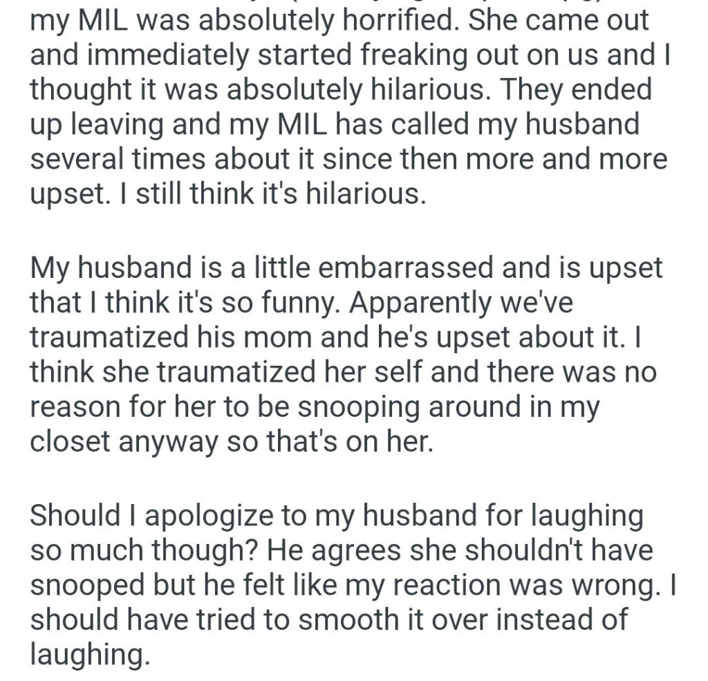 The in-laws left in a huff. The MIL has been blowing up her “perfect” son’s phone ever since, “more and more upset.” And the husband? He’s “a little embarrassed” and “upset that I think it’s so funny.”