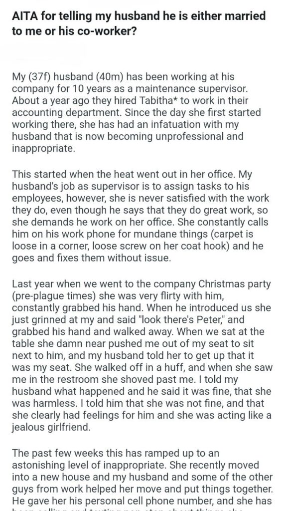 Our narrator, a 37-year-old woman, is married to a 40-year-old man who is apparently the most desirable Maintenance Supervisor on planet earth. About a year ago, a woman named “Tabitha” started in the accounting department, and she has, in the narrator’s words, an “infatuation” with her husband.