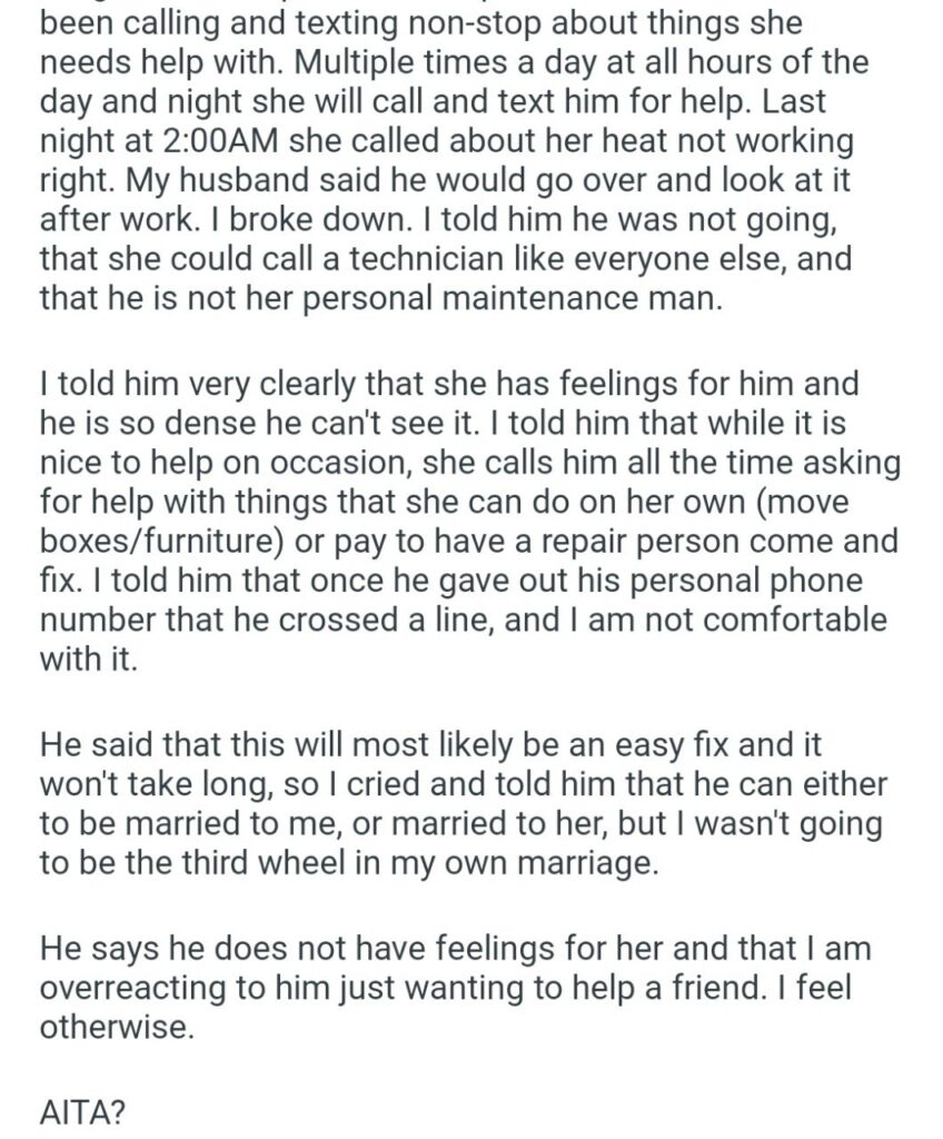 She laid it all out for him: “she has feelings for him and he is so dense he can’t see it,” “she calls him all the time for things she can do on her own,” and “once he gave out his personal phone number… he crossed a line.”