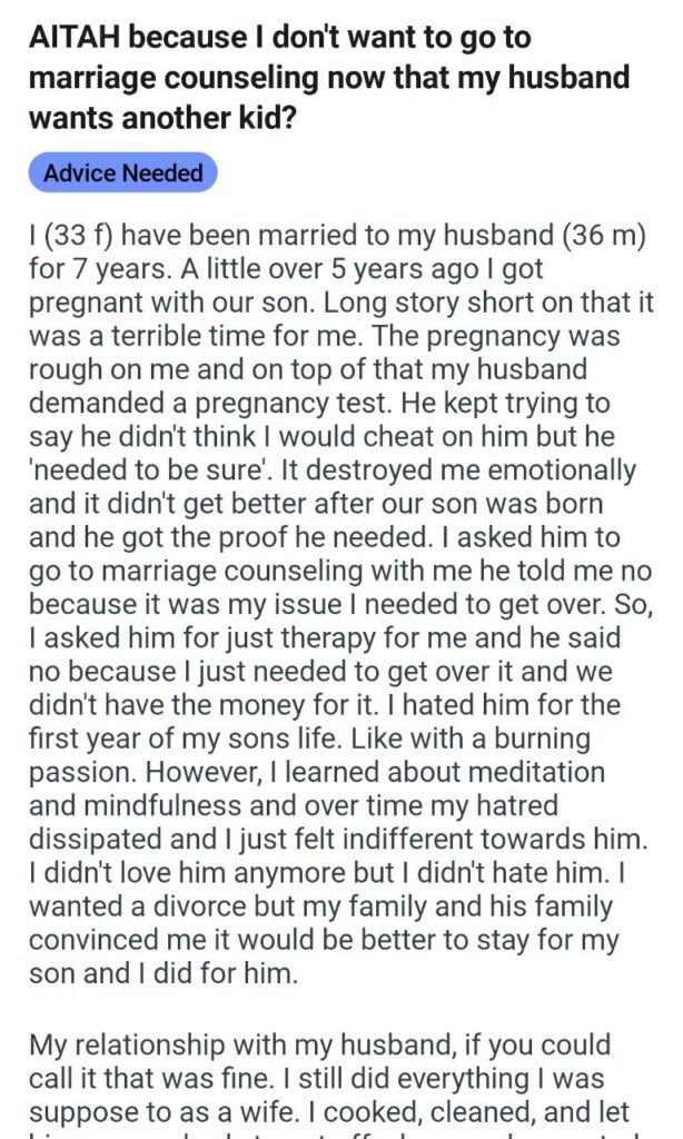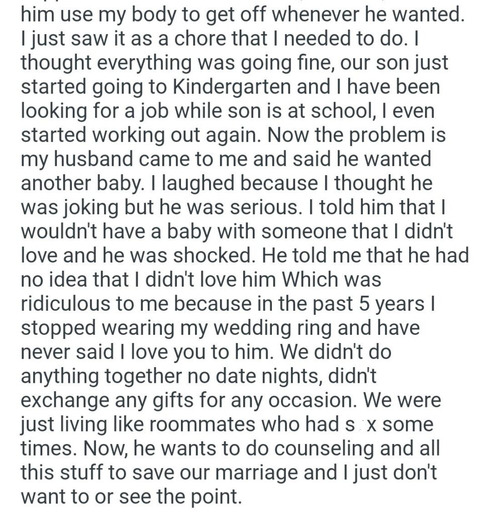 For a year, she hated him with a “burning passion.” Honestly, fair. But eventually, through meditation, that hate turned into something worse: total indifference. She wanted out, but family pressure kept her staying “for the son.” So, she became the perfect Stepford wife on autopilot. She cooked, she cleaned, and in the most devastating sentence I have read today, she “let him use my body to get off whenever he wanted,” viewing s*x merely as another chore on the list. My heart actually hurts for her.