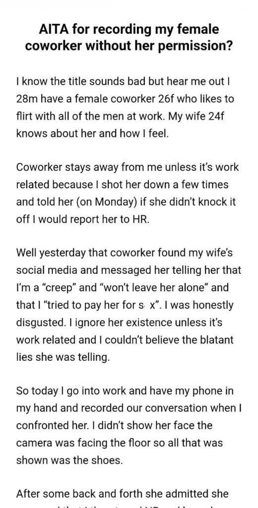 Not long after, this coworker found his wife’s social media. And she messaged her. And what did she say? She told his wife that he is a “creep,” that he “won’t leave her alone,” and that he “tried to pay her for s*x.”