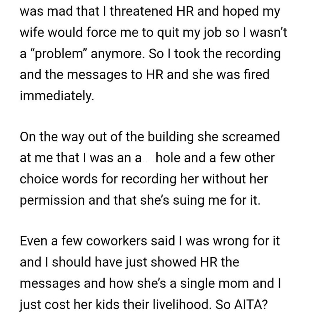 And then, his own coworkers weighed in. A “few” of them said he was “wrong for it” and that he “should have just showed HR the messages.” And then, the classic guilt trip: “how she’s a single mom and I just cost her kids their livelihood.”