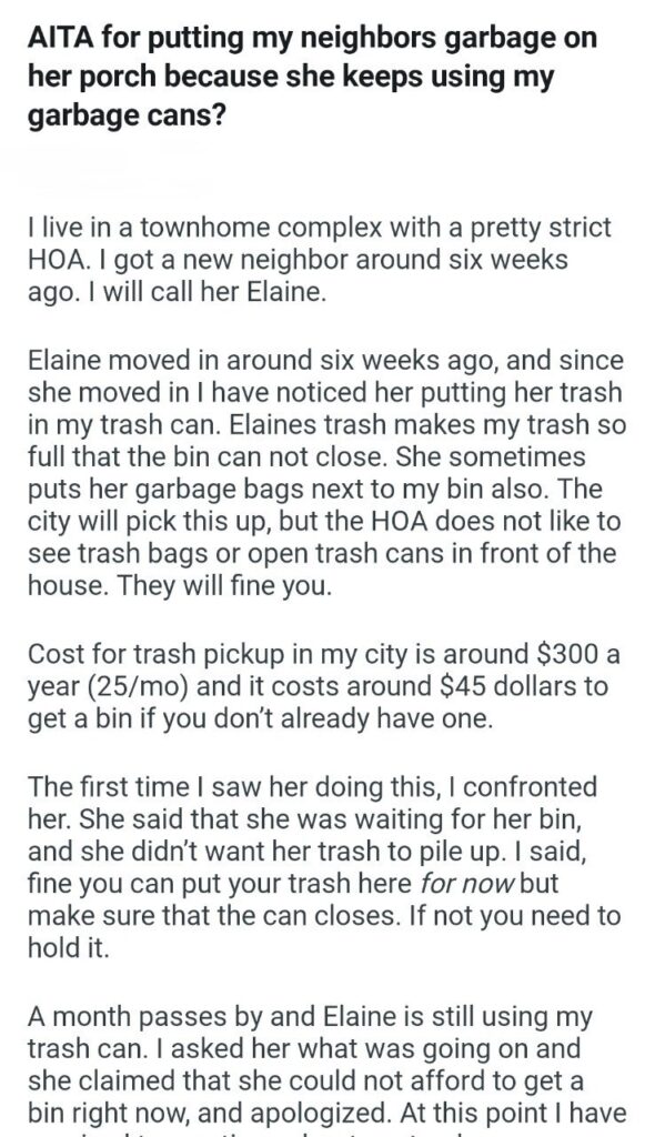 But Elaine, it seems, does not respect boundaries. Last week, the narrator was off work and caught her in the act, again, putting an “enormous amount of trash” in his bins. She thought she was being slick. She thought wrong.