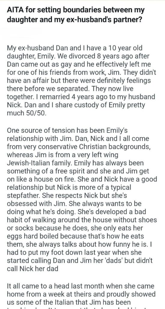 Our narrator is a mom to a 10-year-old girl named Emily. She and Emily’s dad, Dan, divorced eight years ago after Dan came out as gay and got together with his partner, Jim. Mom has also remarried, to a “typical stepfather” named Nick.