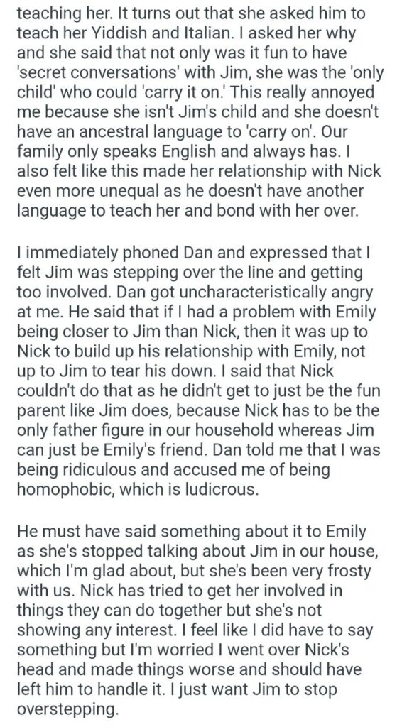 I think you are out of line. I fail to see why Nick must have a relationship with Emily that is equal to Jim’s. It seems to me that this is a problem you, the narrator, created. Not one that Jim or Emily have caused. I would think you should be thankful that your daughter has a friend in Jim and that she has adjusted well to her father coming out rather than turning this into your personal competition between your new husband and your ex-husband’s new partner. It seems like misplaced jealousy more than anything. YTA, I think.