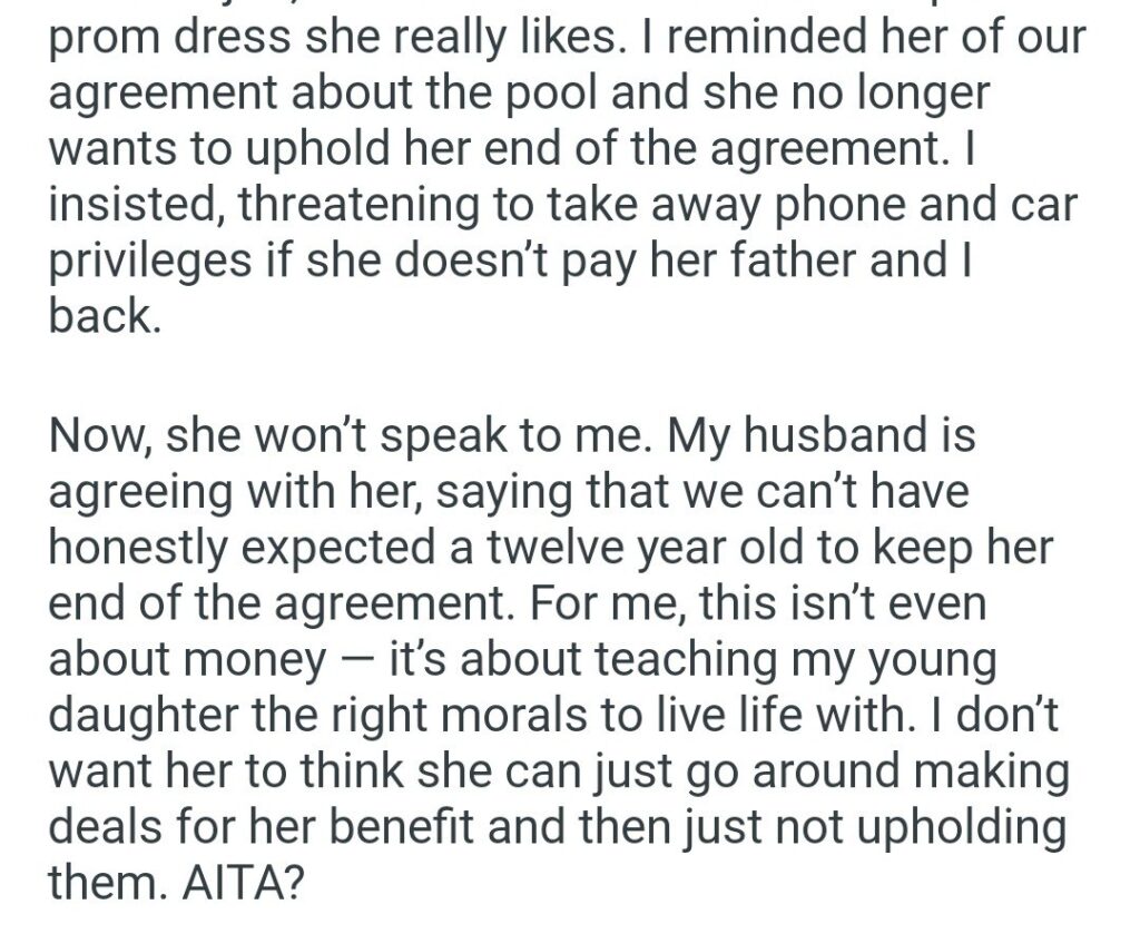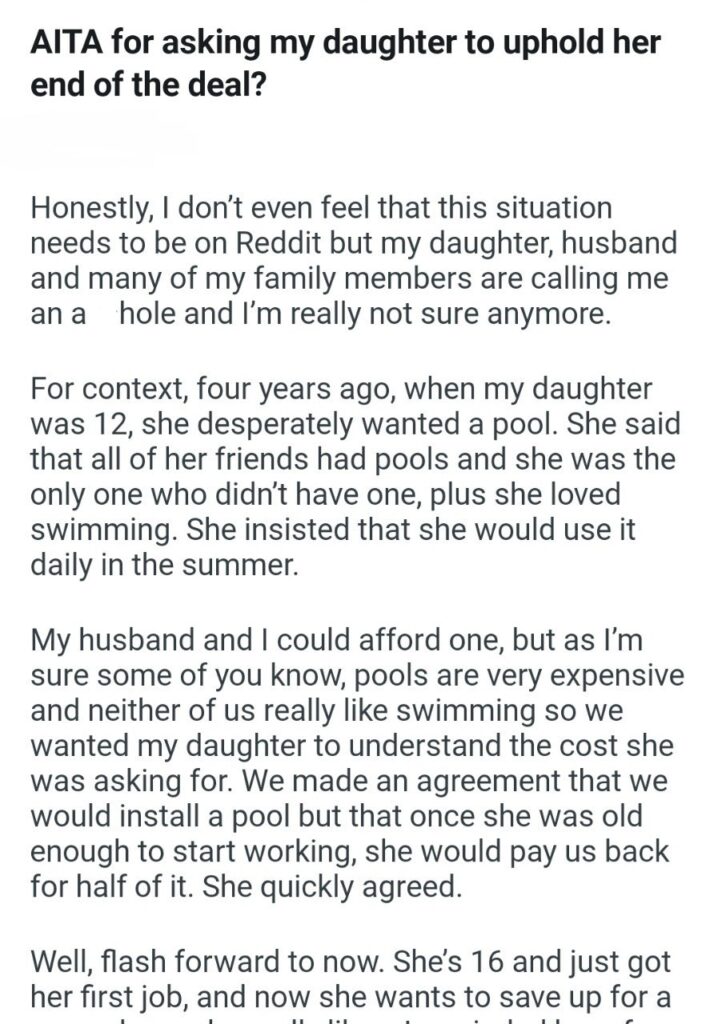 They told their child that they would install the pool only if she agreed to pay them back for half of it once she was old enough to work. The daughter “quickly agreed.” Of course she did. She was twelve. To a twelve-year-old, fifty bucks is a fortune. She has absolutely no concept of what an in-ground pool costs or what it takes to earn that kind of money at an entry-level job.