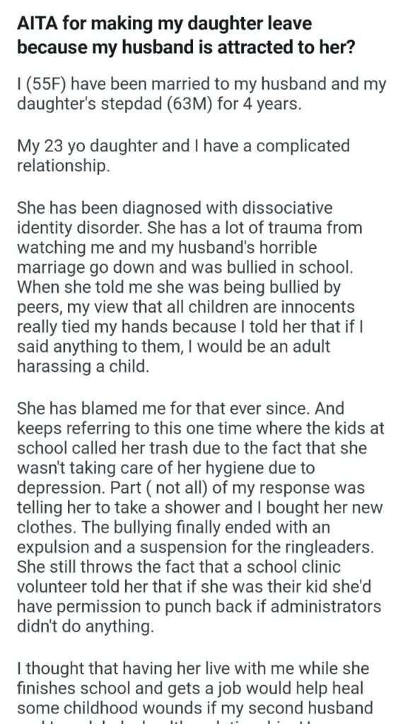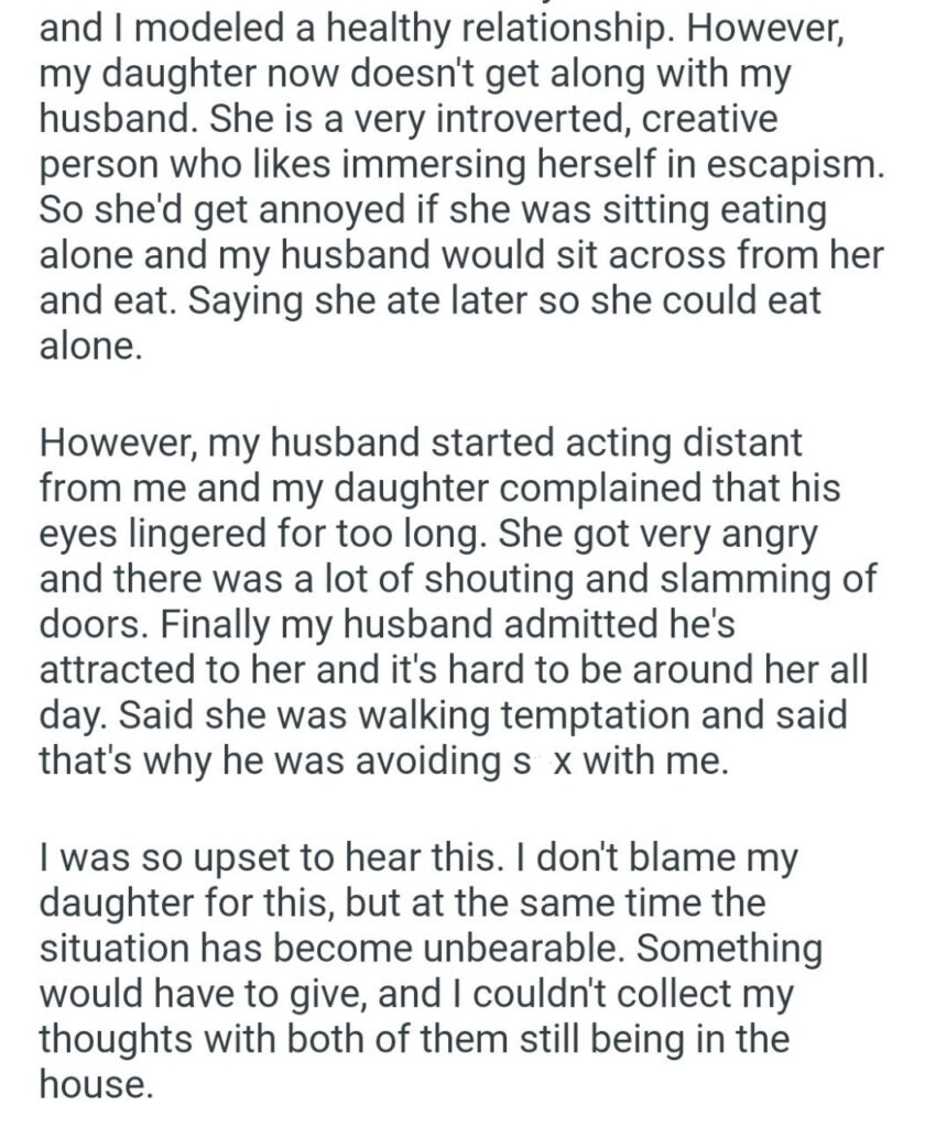 The daughter got angry. There was shouting. And finally, the husband admitted the horrifying truth. He told his wife that he is attracted to her 23-year-old daughter. He called her “walking temptation.”