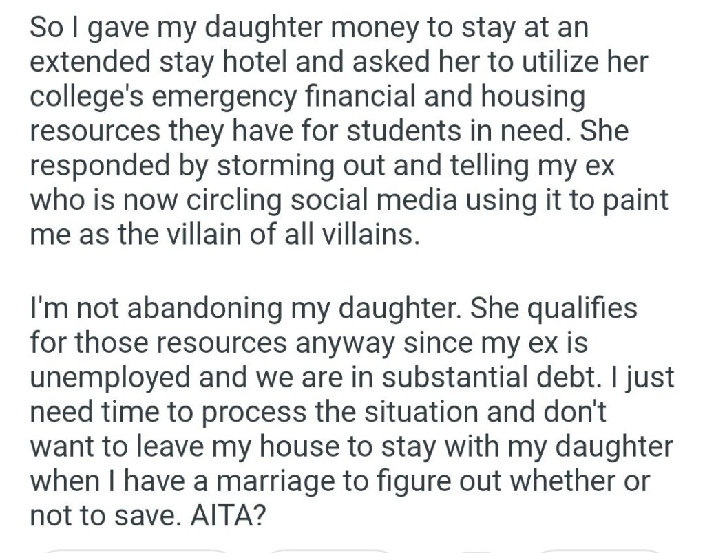 And her justification? This is the part that will make you truly rage. She says, “I just need time to process the situation and don’t want to leave my house to stay with my daughter when I have a marriage to figure out whether or not to save.”