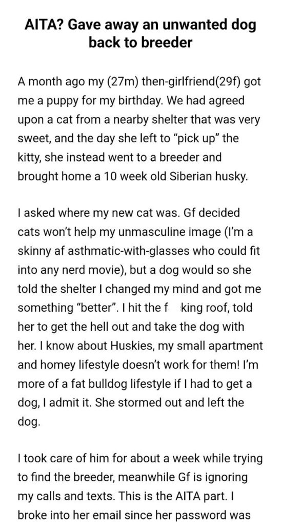 We need to have a serious conversation about gift-giving and the absolute audacity of partners who try to “fix” their significant others through surprise pets. Usually a bad gift is something like a sweater in the wrong size or a video game you already own. But one man on Reddit just received a birthday present that wasn’t just a bad gift but actually a life-altering burden wrapped in toxic masculinity.