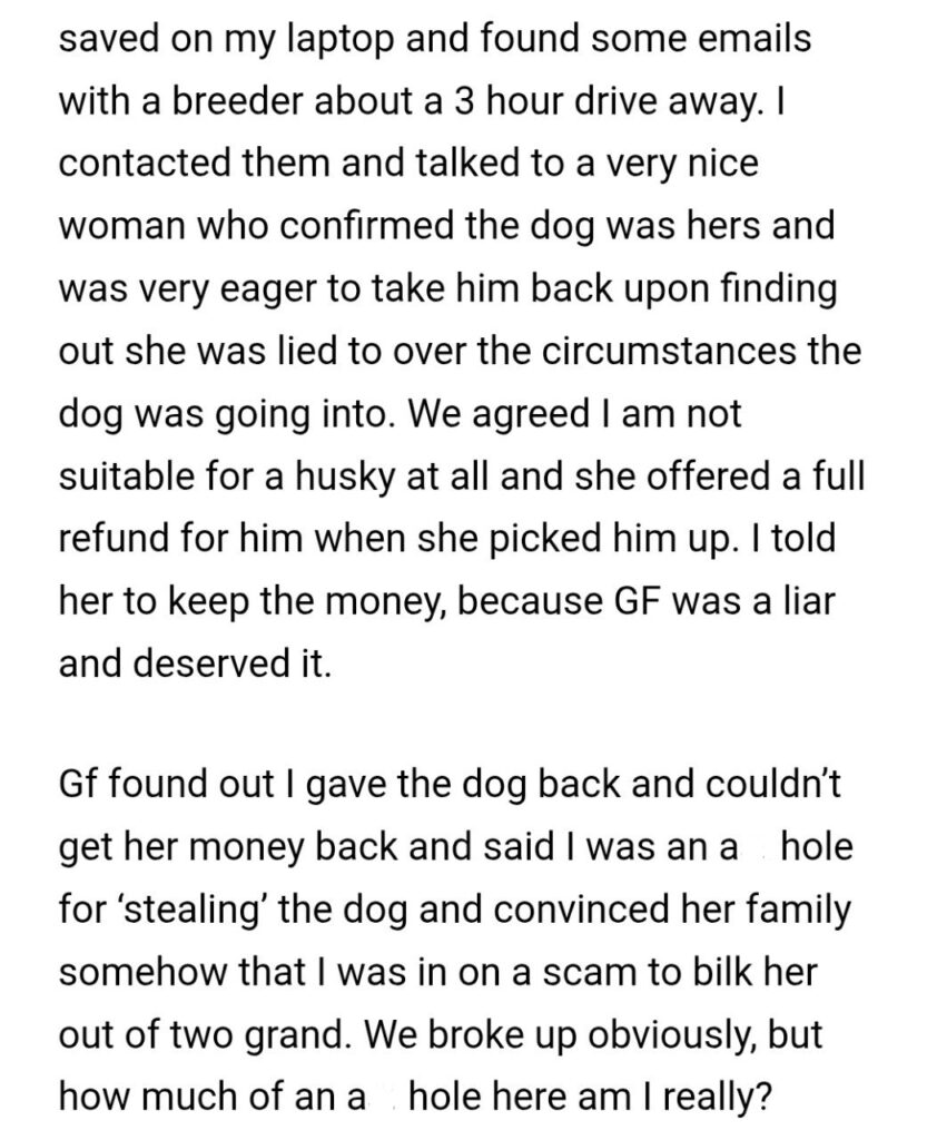 When the girlfriend finally resurfaced and found out the dog was gone and her $2,000 was gone with it she lost it. She accused him of “stealing” the dog and tried to convince her family he was running a scam.