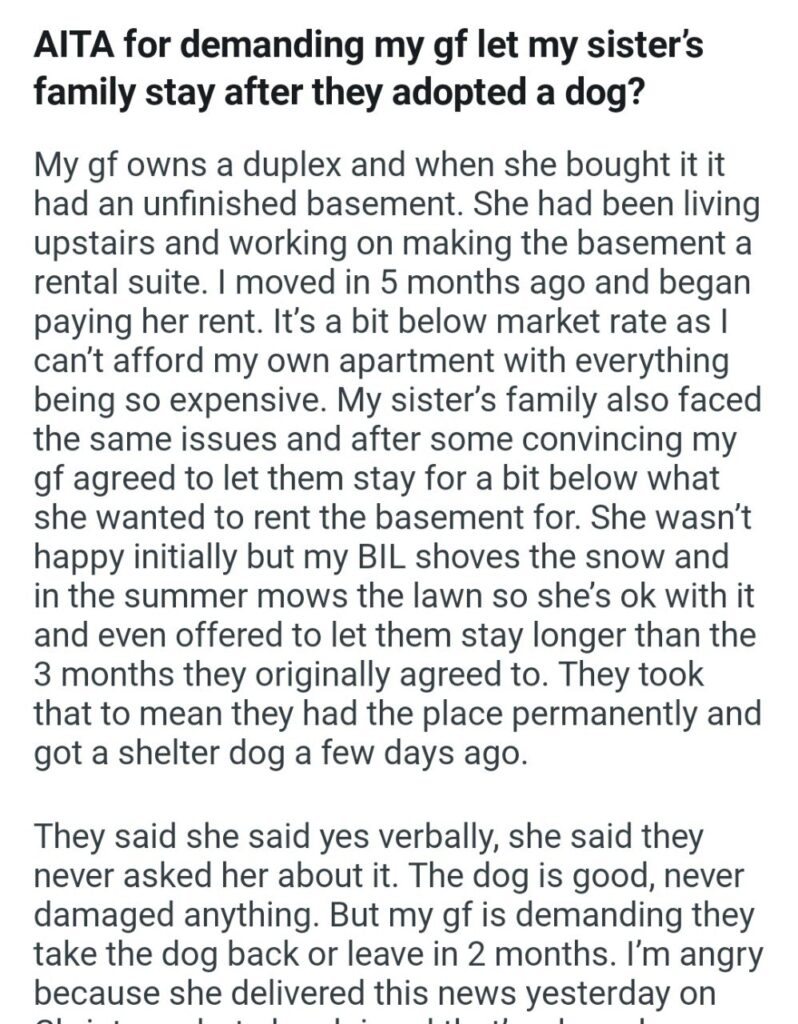 This Gf Let Her Bf’s Family Live in Her Basement, They Snuck in a Dog, and Now He’s Calling Her “Cruel”