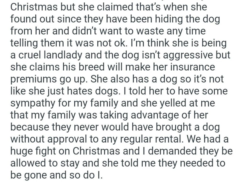 And this is where the narrator goes from “clueless boyfriend” to “King A**hole.” They had a huge fight. On Christmas. And he demanded that she let his family stay. He, the man who is also her tenant, demanded that she, the owner, just roll over and accept the new dog, the new insurance bill, and the new, blatant disrespect.