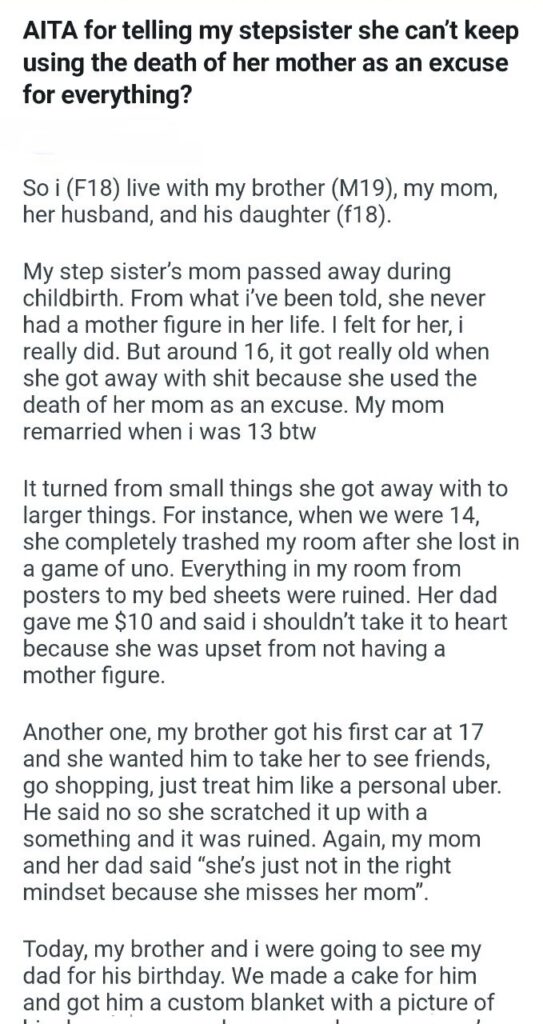 Our story comes from an 18-year-old girl living in a blended family nightmare. She lives with her brother, her mom, her stepdad, and his 18-year-old daughter. The stepsister has a tragic backstory: her mother passed away during childbirth. That is undeniably awful, and growing up without a mother figure is a deep wound. However, the narrator points out that around age 16, the stepsister started using this tragedy not just as a source of sadness, but as a universal hall pass for bad behavior.