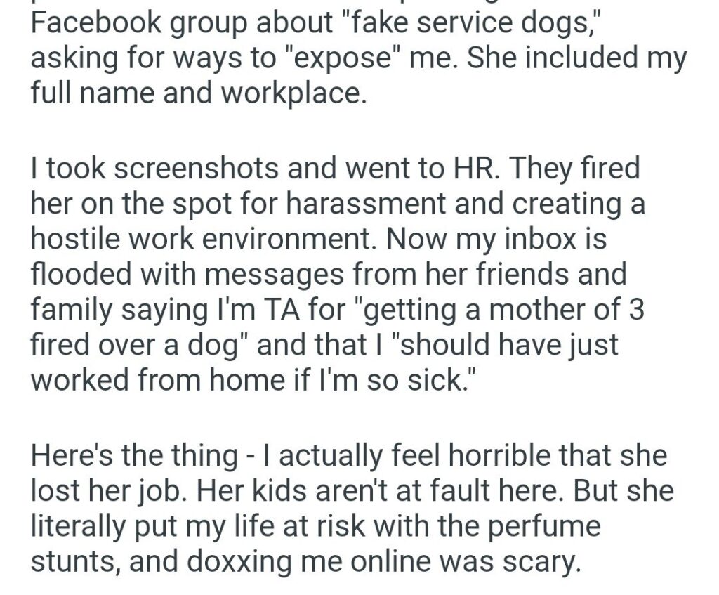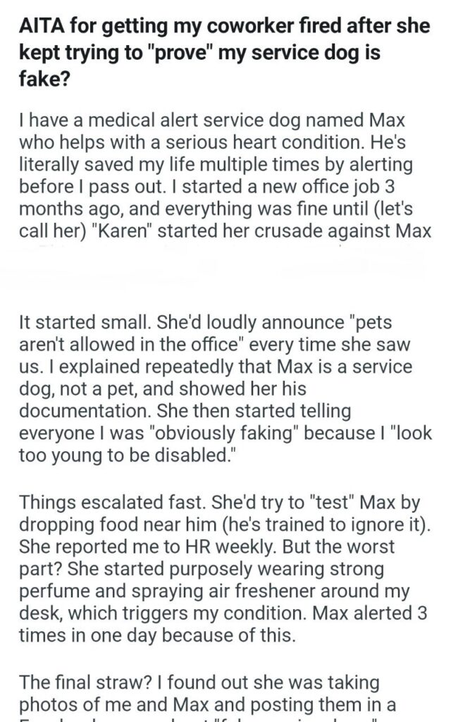 And this is where the story takes a turn from “unbelievably annoying” to “actually horrifying.” Karen, in her one-woman quest to “expose” a perfectly legal and necessary service dog, started purposely wearing strong perfume and spraying air freshener around the narrator’s desk. Why? Because this triggers the narrator’s heart condition.
