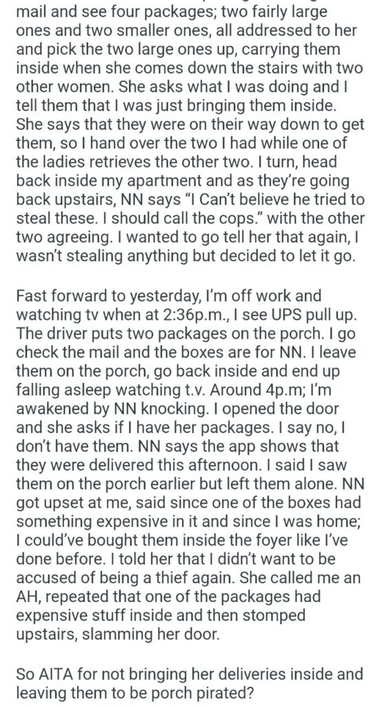 So, is he the ahole for letting a porch pirate do their thing? Absolutely not. He wasn’t being malicious; he was just respecting her very clear, albeit insane, boundary: “Don’t touch my packages, you ‘thief’.” This is a classic, textbook case of “Play Stupid Games, Win Stupid Prizes.”