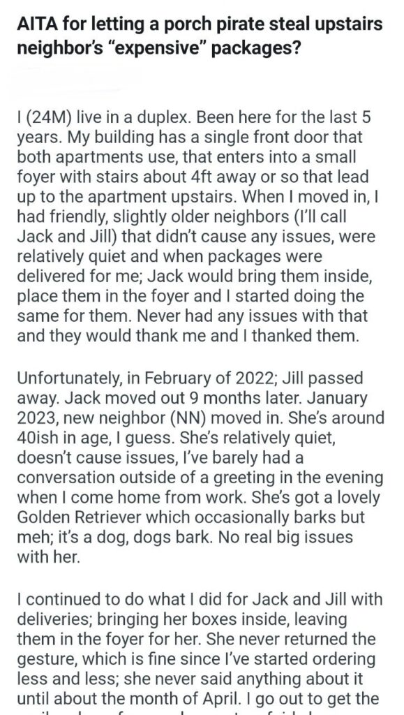 Our narrator, a 24-year-old man, is a card-carrying “Good Neighbor.” For years, he lived in his duplex and had a perfect, harmonious relationship with his older neighbors, “Jack and Jill.” They had a beautiful, symbiotic system: if a package was on the porch, whoever saw it first would bring it into the safe, shared foyer. They’d thank each other. It was a utopia of neighborly respect.