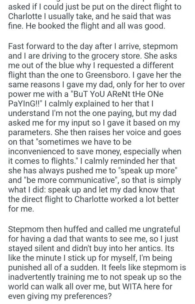 Ah, there it is. The real issue. This has nothing to do with the flight. This has nothing to do with money (the flights were probably almost identical in price). This has to do with control. This has to do with the fact that the stepdaughter had an opinion, her dad validated it, and the stepmom wasn’t in the middle of the decision.
