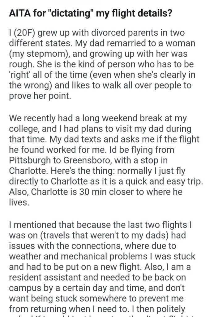 Our narrator is a 20-year-old woman who, like many of us, is a seasoned pro at navigating divorced parents in different states. She was planning a trip to see her dad, who is remarried to a woman she describes as, well… rough. The stepmom is the type who “has to be ‘right’ all of the time” and “likes to walk all over people.” We all know the type.