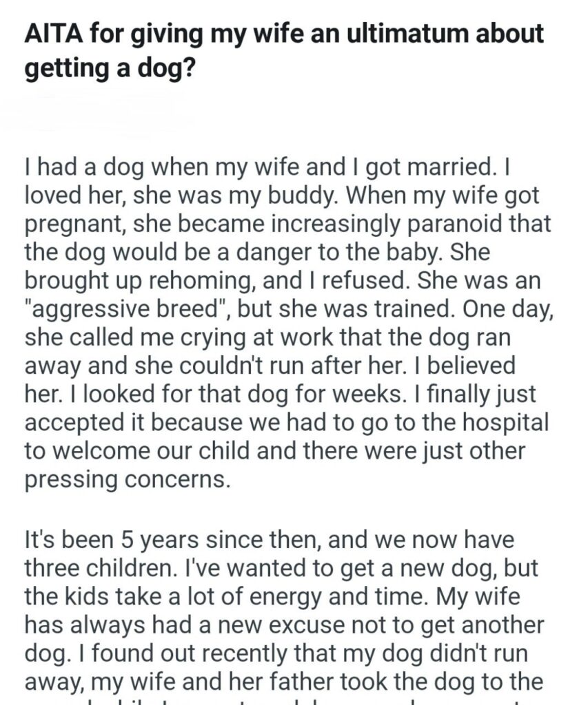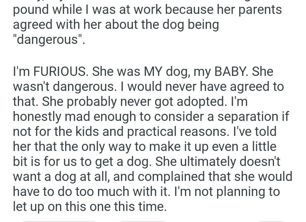 So, what does he want? He’s not even demanding a divorce, yet. He has given her an ultimatum. The only way for her to “make it up even a little bit” is for them to get a new dog. This is not an unreasonable request. This is the bare-minimum, “show-me-you-are-not-a-complete-monster” compromise.