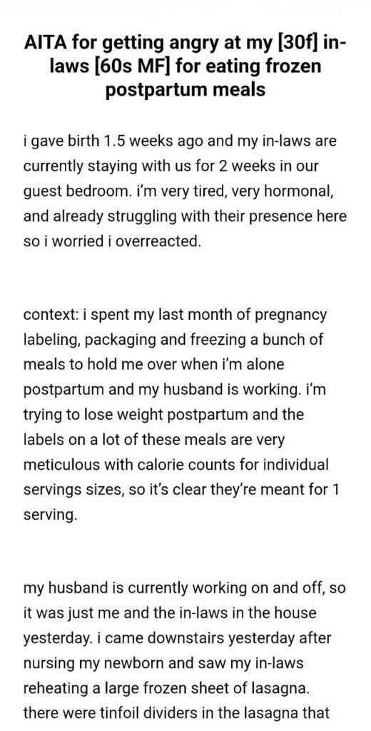 Anyone who has had a baby knows that “help” from in-laws often translates to them holding the newborn while the bleeding, exhausted mother fetches them coffee and cleans the kitchen. OP had prepared for the inevitable chaos by spending the last month of her pregnancy meticulously preparing, packaging, and freezing individual meals. These weren’t just random leftovers. They were labeled with exact calorie counts because she is trying to manage her weight postpartum. They were clearly marked as single servings meant for her survival when her husband goes back to work.