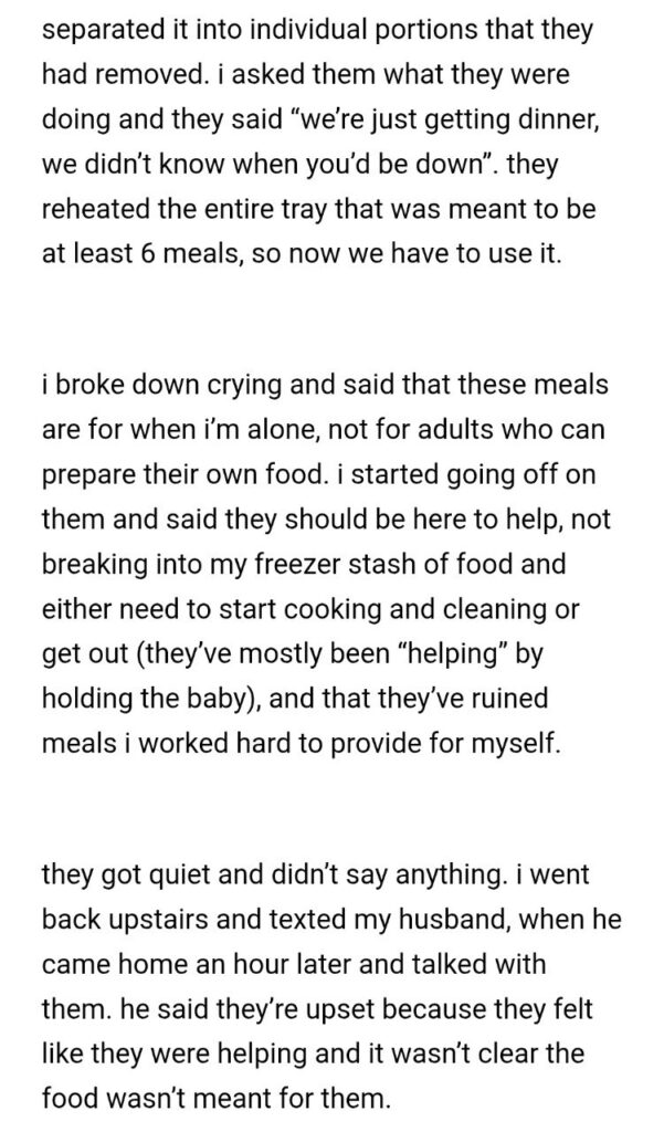 Naturally, the OP snapped. She broke down crying because, let’s be real, crying is the baseline emotional state at 1.5 weeks postpartum even without people stealing your food. She unleashed the fury of a hungry, tired mother. She told them exactly what they needed to hear. She said these meals were for when she was alone, not for able-bodied adults capable of operating a can opener.