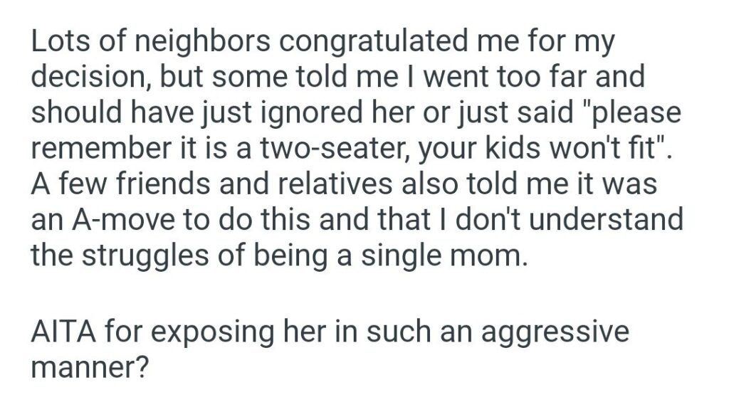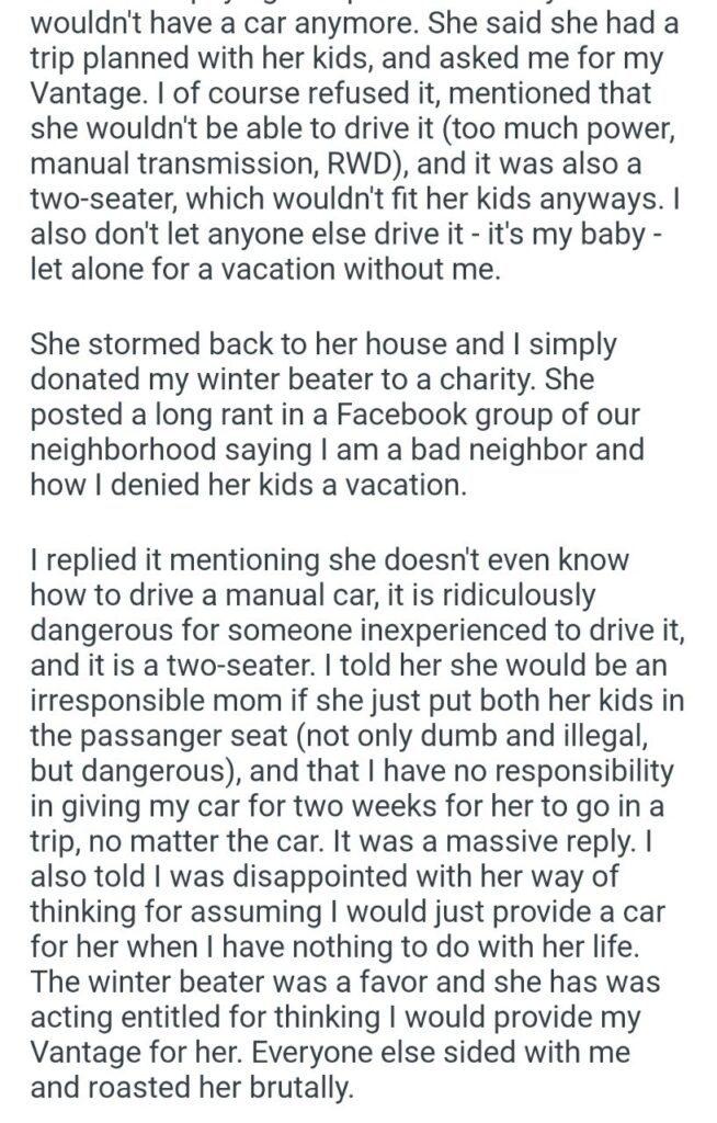 But she picked the wrong neighbor to mess with. He didn’t just sit back and take it. He replied with a “massive” post, and he brought receipts. He calmly, and publicly, explained the facts. He pointed out that she doesn’t know how to drive a manual. He mentioned the car is a two-seater and that her plan would involve being an “irresponsible mom” by illegally and dangerously stuffing her kids in the passenger seat.