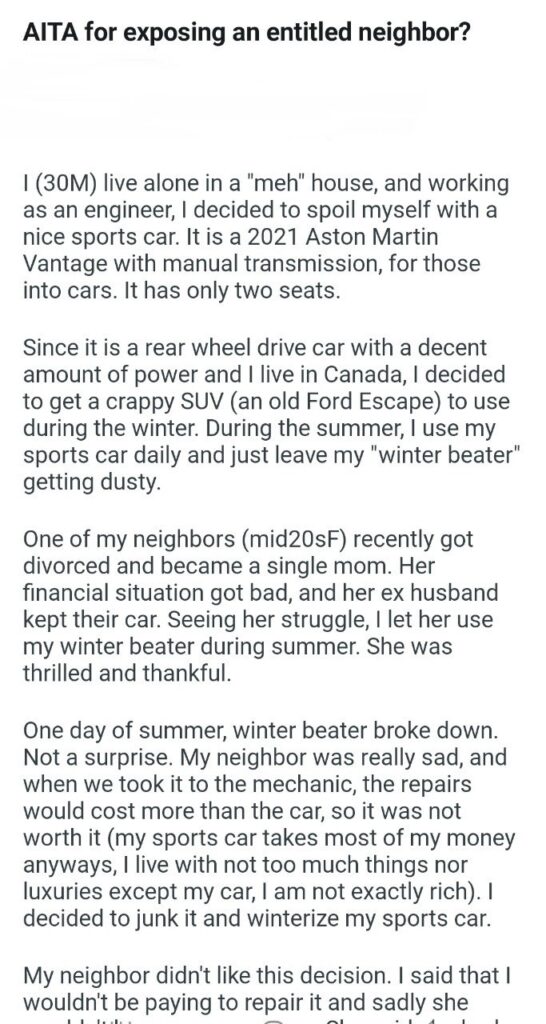 He finished by calling her out for her entitlement, reminding everyone that the beater was a favor and that he has zero responsibility to provide a car for her life, let alone his luxury sports car. The neighborhood, now armed with the full context, sided with him and “brutally roasted” her. A public shaming for the ages, all started by her.