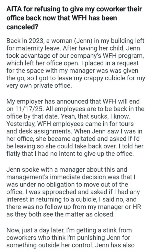This isn’t a fight between the narrator and Jenn. This is two employees being put in a terrible position by a company that could solve this in five seconds by, you know, managing. The company is the real villain for forcing everyone back and having no plan. The narrator is just the one who refuses to be a victim twice. You do not give up the window. You never give up the window.