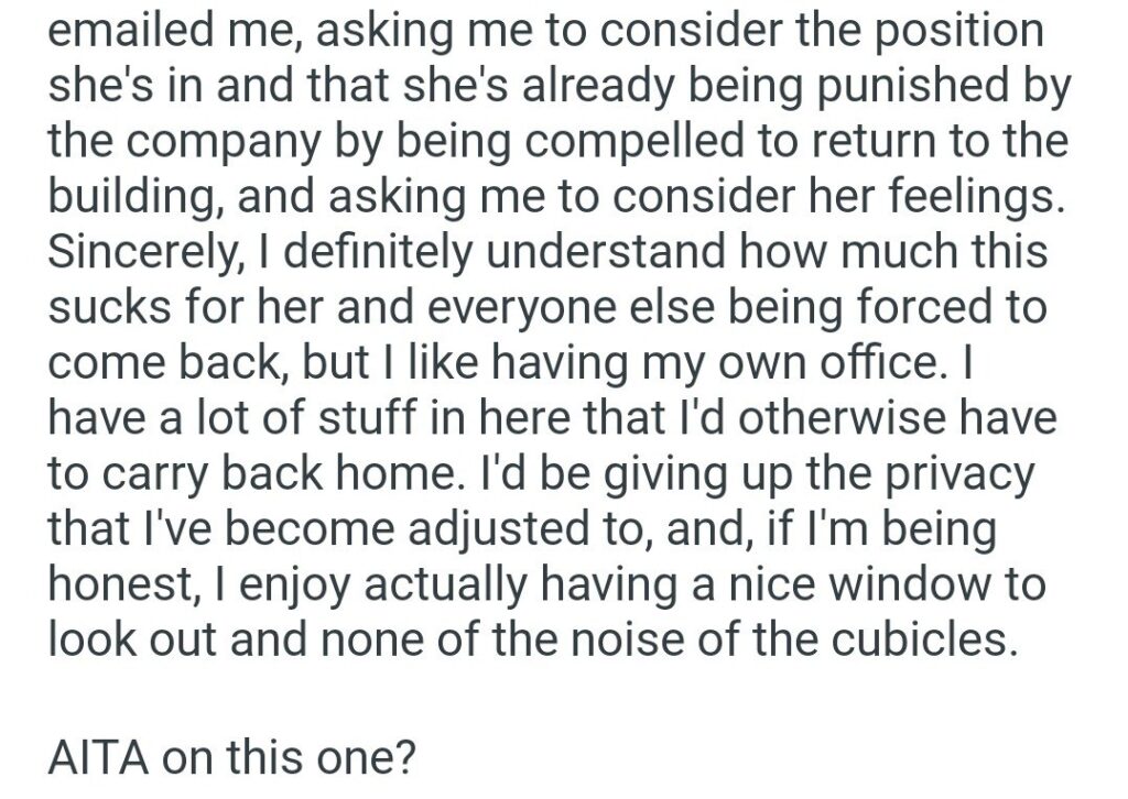 And our narrator’s internal monologue is just chef’s kiss. They admit they understand it sucks for her, but also, “I like having my own office.” They have “a lot of stuff in here” they don’t want to carry home. They like the “nice window” and the “privacy.” This is the most honest, relatable, and unsympathetic take I have ever seen, and I am living for it.