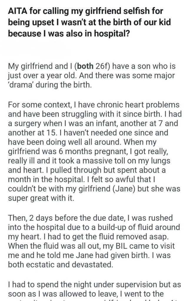 Our narrator is a 26-year-old woman who has battled chronic heart problems her entire life. We are talking multiple major surgeries before she was even old enough to drive. This isn’t a mild inconvenience; it is her reality. When her girlfriend, Jane, was six months pregnant, OP got so sick with lung and heart issues that she spent an entire month in the hospital. That is terrifying enough on its own. Jane was supportive back then, but apparently, her patience for life-threatening medical emergencies runs on a very strict timer.
