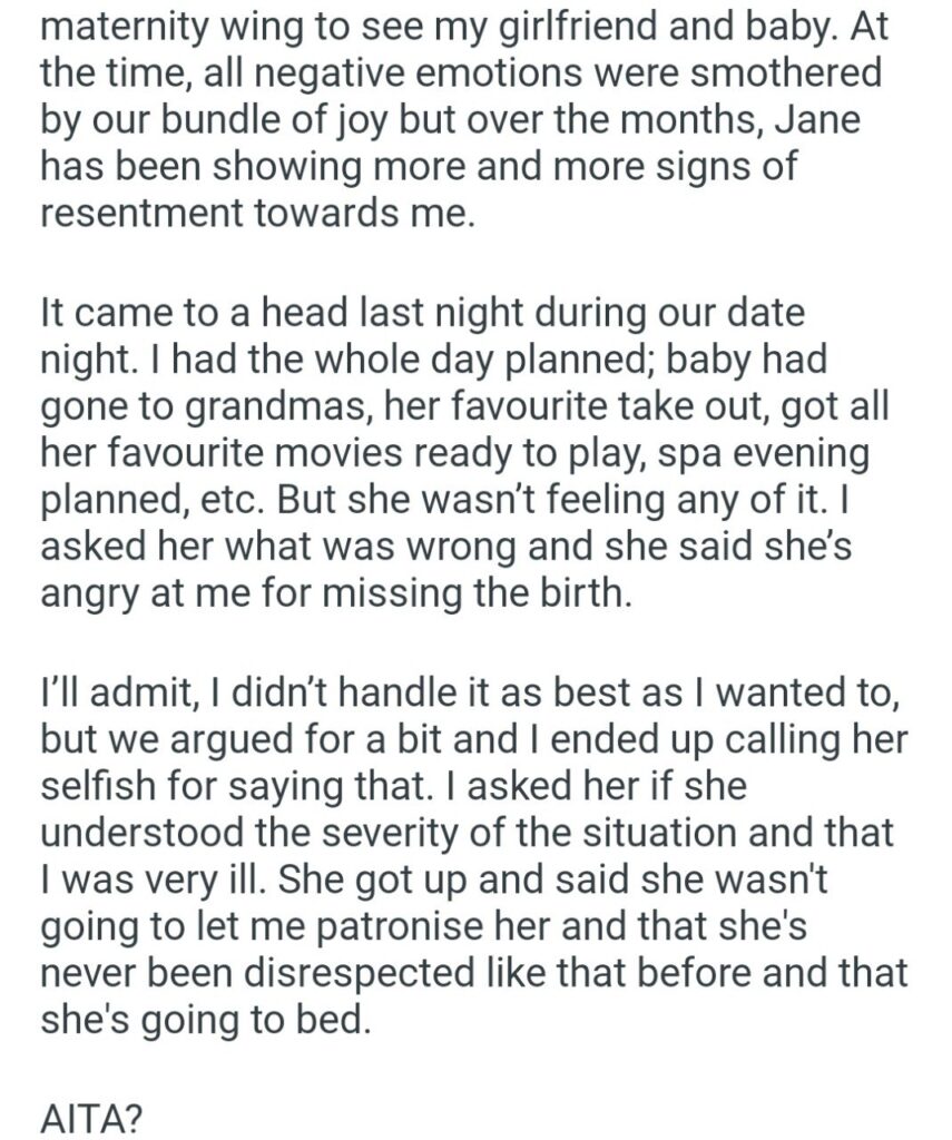 Over the last year, Jane has apparently been stewing in a toxic pot of resentment that finally boiled over on a recent date night. OP planned a whole beautiful evening. Grandma took the baby, she got Jane’s favorite takeout, planned a spa night at home, the whole nine yards. But Jane wasn’t having any of it. When OP finally asked what was wrong, Jane dropped the bomb: She is still furious that OP missed the birth.
