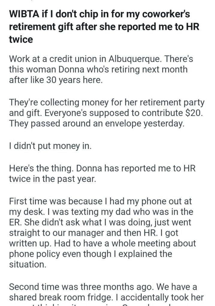 Of course not. She sprinted straight to the manager and then to HR. The narrator got a formal write-up. She had to sit through a whole meeting about phone policy, even after explaining her father was in the ER. That alone is enough to earn Donna a lifetime of “no” from the party fund.