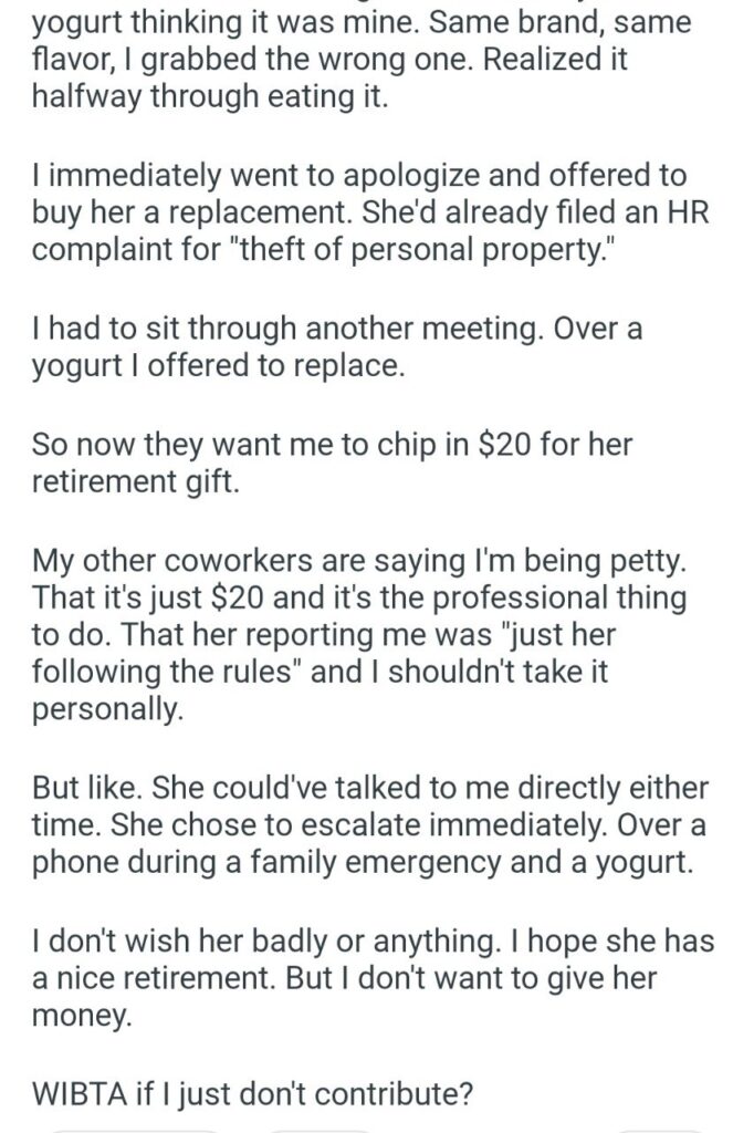 So, is she the ahole if she doesn’t contribute? Absolutely not. N-T-A. She is a hero. I would take that $20, buy myself a very nice lunch, and toast to the fact that I never have to see Donna or her thieving yogurt again. Good riddance.
