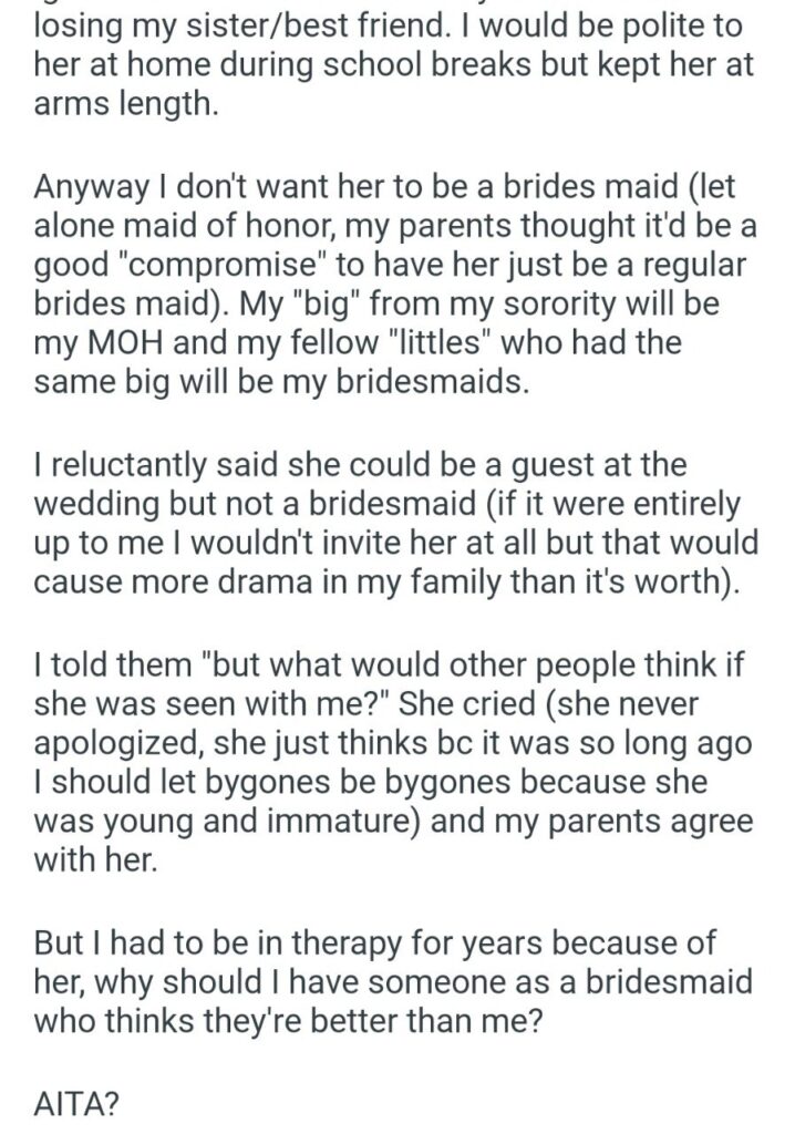 Fast forward to the present. The OP went to college across the country, joined a sorority, found her own tribe, and healed through years of therapy. Now she is getting married and has chosen her sorority “big” as her Maid of Honor and her friends as bridesmaids. Her parents, desperate for a picture-perfect family moment, suggested a “compromise” where the twin is just a regular bridesmaid. The OP said absolutely not.