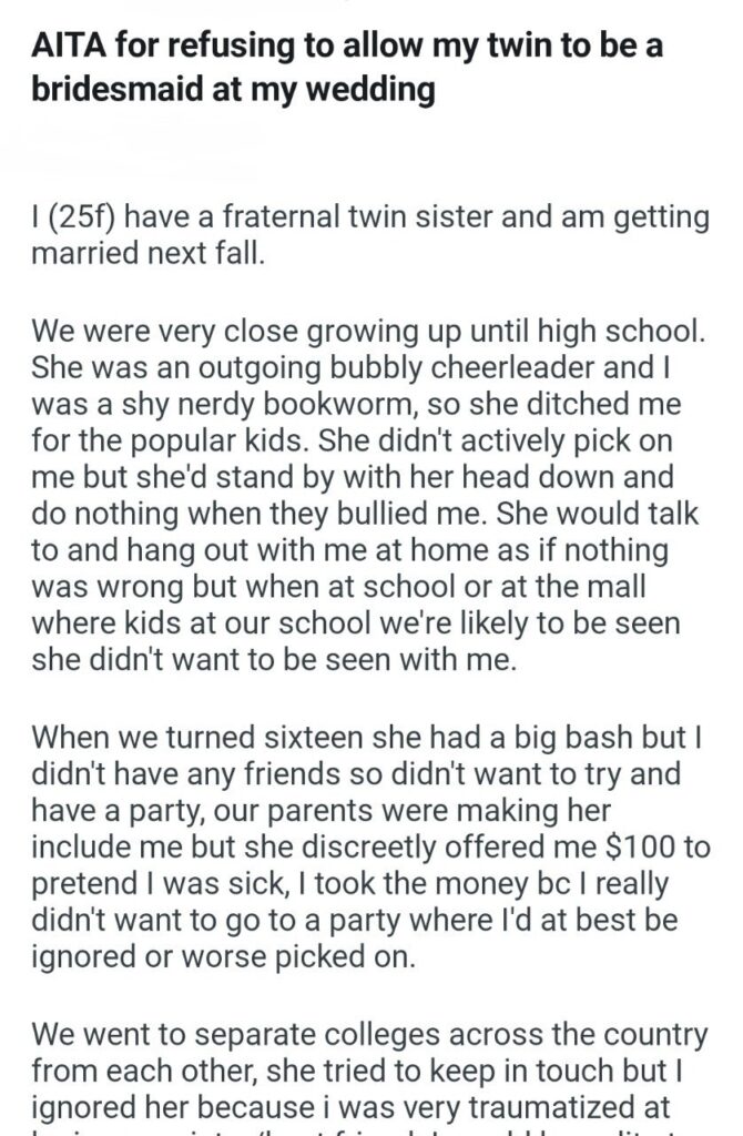 So is she the ahole? Absolutely not. N-T-A. The sister showed her true colors when she paid 100 dollars to erase her twin from a birthday party. She bought her way out of the relationship back then, and she can’t buy her way back in now just because there is a photographer present. The bride owes her nothing but a seat in the back row, far away from the altar.