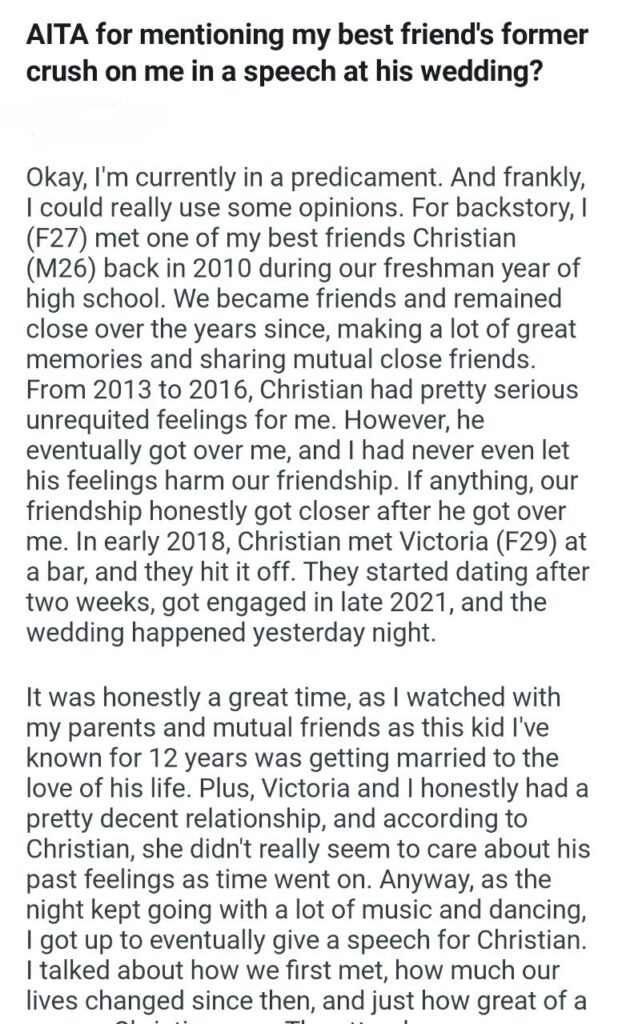 Let’s set the scene. Our narrator, a 27-year-old woman, has been best friends with the groom, Christian, since they were freshmen in high school. Theirs is a long, storied friendship, complete with one little wrinkle: for three years in high school, Christian had a massive, unrequited crush on her. But he got over it, they stayed friends, and their bond even grew stronger. A classic tale.