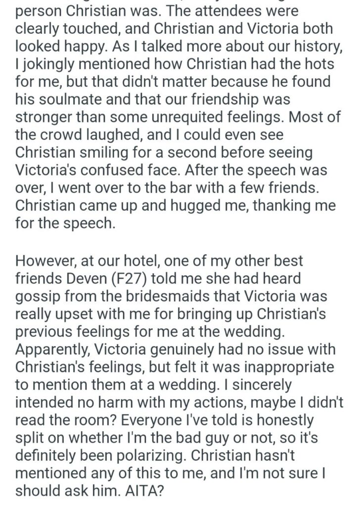 So, is the narrator the ahole? Yes. A well-intentioned ahole, perhaps, but an ahole nonetheless. Her intentions were harmless, but the impact was what mattered. She failed to read the room, the country, and the continent. The fact that Christian hugged her afterward doesn’t mean it was okay; it means he’s a good guy who was trying to avoid drama on his wedding night.
