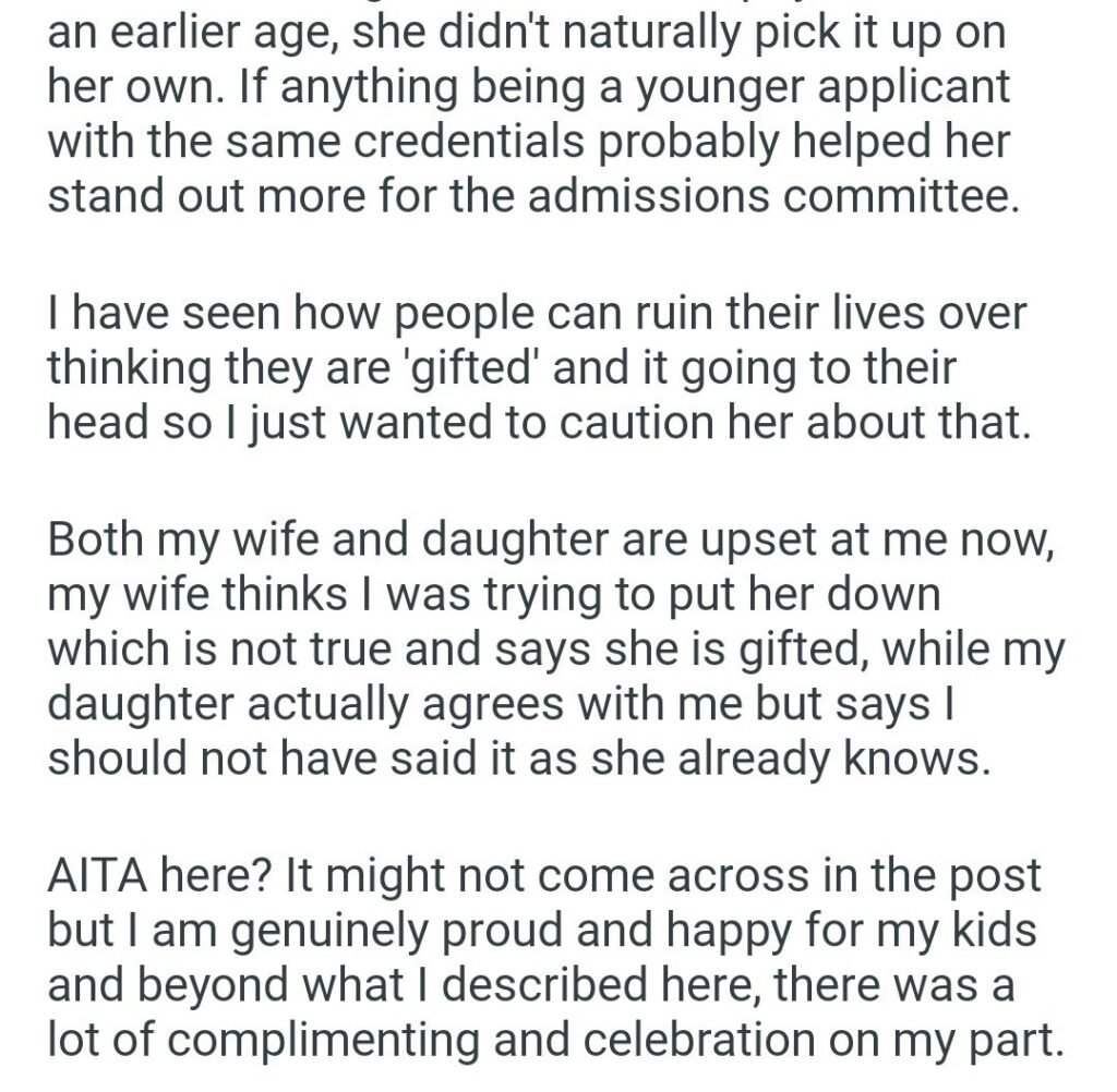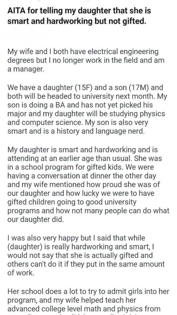 The daughter… agreed with him. She told him she “already knows” she’s not gifted. This poor child, who is objectively in the top one percent of her age group, has already internalized her father’s “logic” so deeply that she can’t even accept a compliment from her own mother. She wasn’t upset that he was wrong; she was upset because he was cruel enough to say the quiet part out loud at her party.