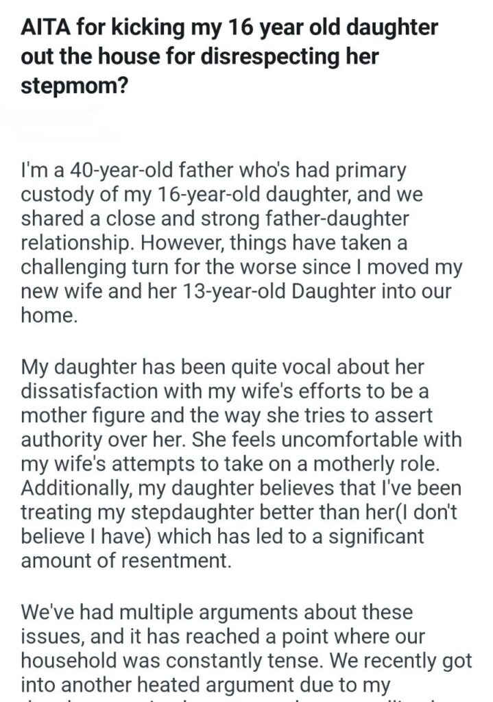 Our narrator is a 40-year-old father who, until recently, had a “close and strong” relationship with his 16-year-old daughter. He had primary custody. They were a team. But then, he decided to move his new wife and her 13-year-old daughter into their home. And that is when the wheels fell off the bus.
