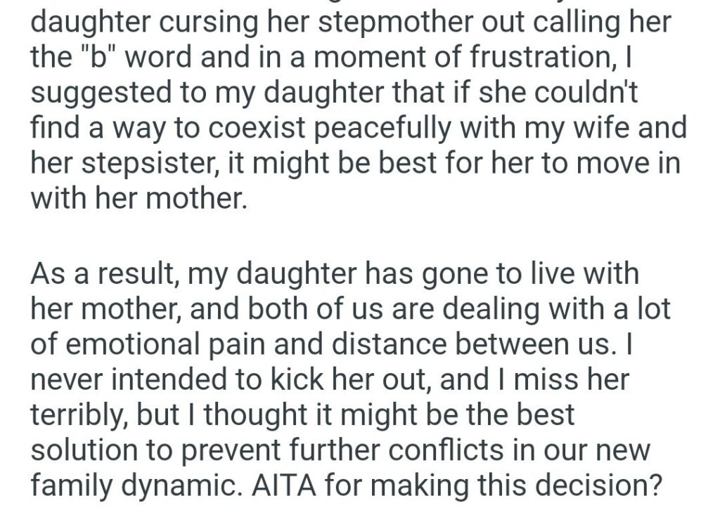So, is he the ahole? Yes. A thousand times, yes. You are the ahole. You let your new wife overstep, you ignored your daughter’s feelings of being replaced, and when she finally lashed out, you sent her away. You didn’t just kick her out of the house; you kicked her out of your life. Don’t be surprised if she never comes back.