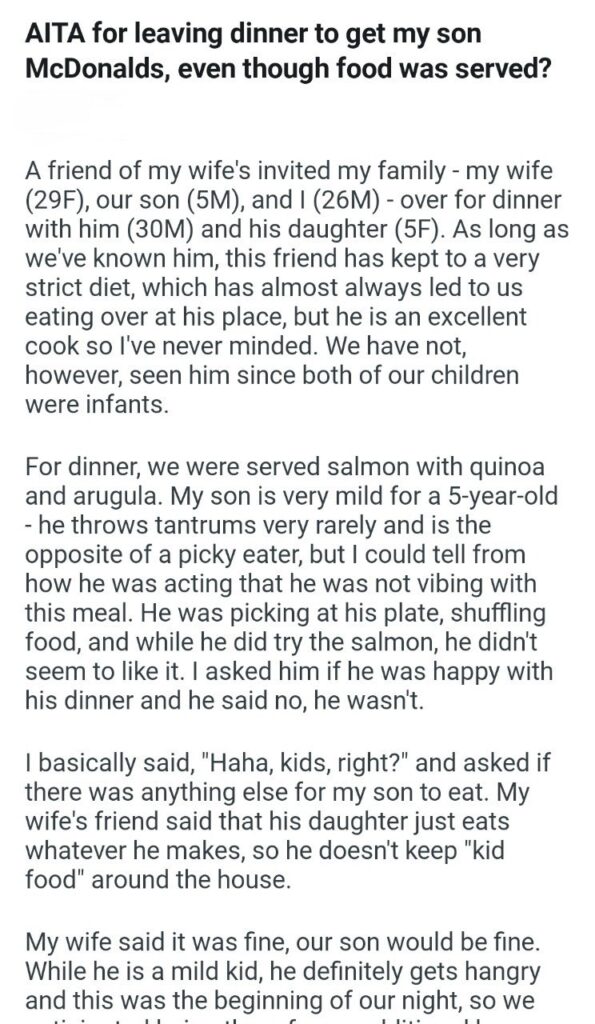 So, is he the ahole? Absolutely not. N-T-A. You are not the ahole. You are a responsible parent who prevented a meltdown. Expecting a 5-year-old to happily eat salmon and arugula is delusional. A good host considers their guests, especially children. Your friend chose his strict diet over basic hospitality. Your wife chose to defend his rudeness over her own child’s hunger. You did exactly what a good dad should do.