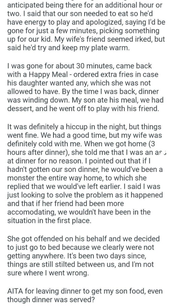 So, our hero made a snap decision. He said their son needed to eat for energy, apologized to the irked host, and left to pick up food. He was gone for about 30 minutes, came back with a Happy Meal, and even ordered “extra fries in case his daughter wanted any” (which, predictably, she wasn’t allowed to have).