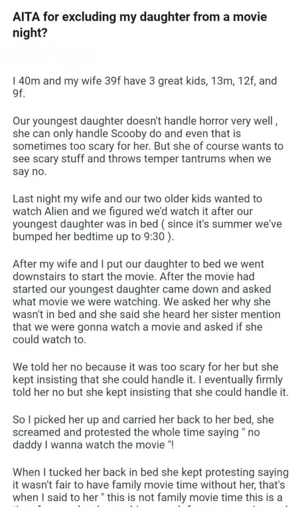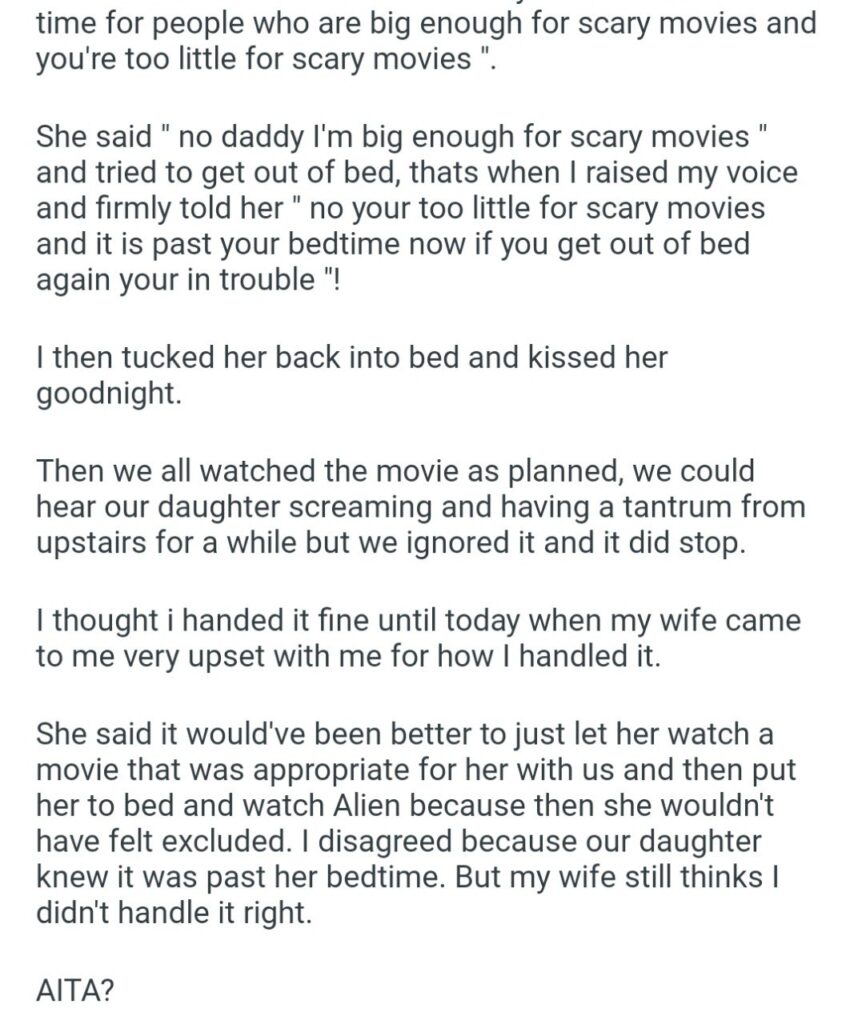 They watched the movie while the daughter threw a tantrum upstairs, which honestly sounds like the soundtrack to most parenting decisions. But the next day, the wife turned on him. She told him he handled it wrong. She argued that they should have watched a “kid-appropriate” movie first so the youngest didn’t feel excluded, and then watched Alien after she went to sleep.