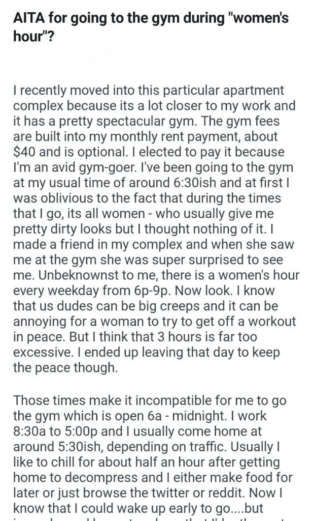 But almost immediately, he noticed the vibe was off. Every time he went to the gym, it was filled with women giving him “dirty looks.” Eventually, a friend in the building filled him in on the secret. Unbeknownst to him, the community had established a “women’s hour” every weekday. But here is the kicker: “hour” is a massive understatement. This supposed hour runs from 6:00 PM to 9:00 PM.
