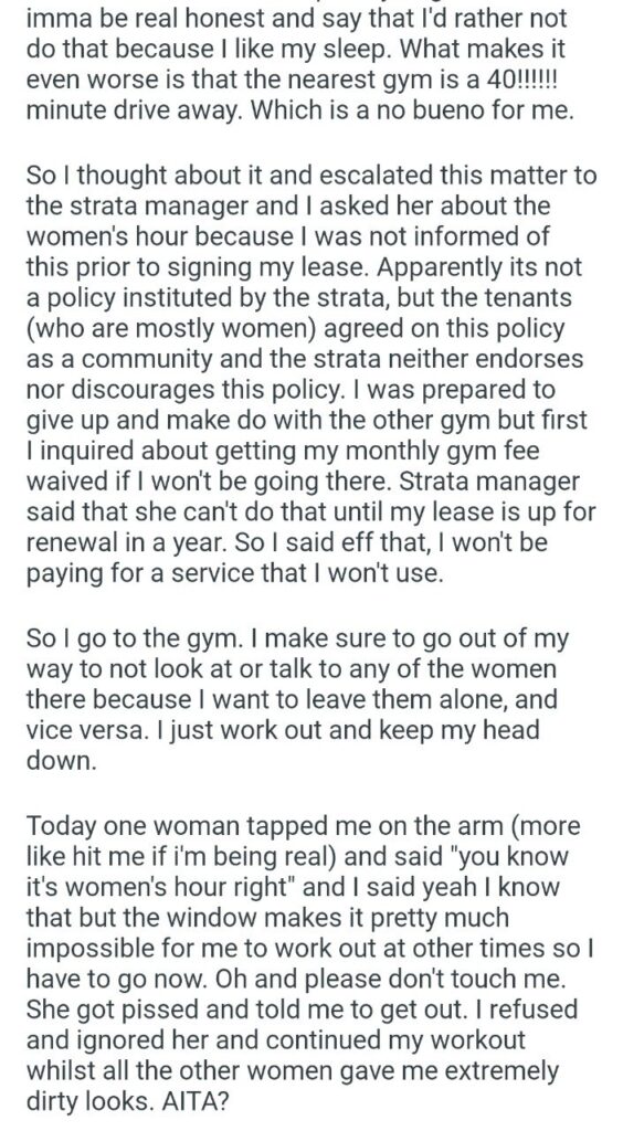 Now he is wondering if he is the ahole. Let’s be real: absolutely not. While gym harassment is a very real issue for women, the solution isn’t to commandeer a shared, paid amenity for 15 hours a week during peak operational times. That is wildly entitled. If these neighbors want a private, women-only gym, they can pool their money and rent a studio space, or petition the building to create one officially.