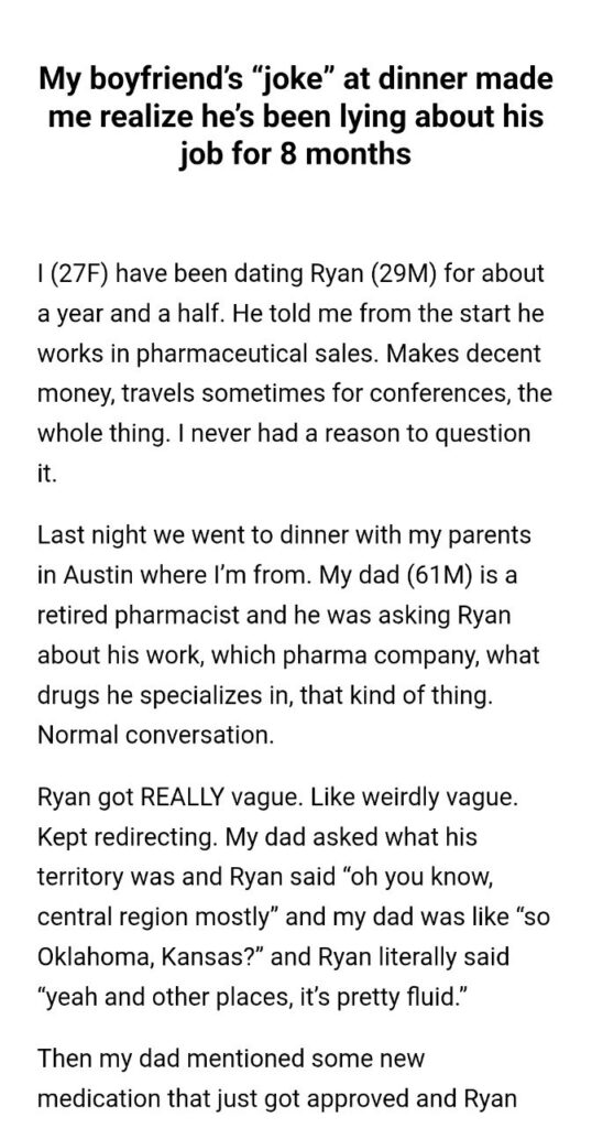 Our narrator, a 27-year-old woman, has been dating “Ryan” for a year and a half. From day one, he told her he worked in pharmaceutical sales. It sounded legit. He made good money, traveled for “conferences,” and had a solid story. She had absolutely no reason to question it.