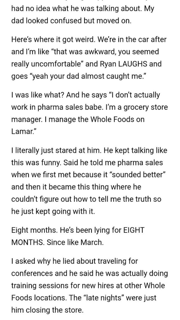 This man has been lying to her for eight months. He told her pharma sales “sounded better” when they first met, and then he just… never stopped. He was so deep in the lie he couldn’t find his way out. Those “conferences” he traveled for? Training sessions for new hires at other Whole Foods. The “late nights” at the office? Just him closing the store.