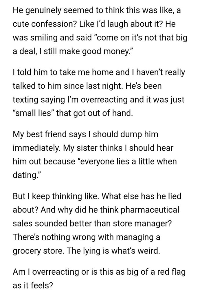 Her best friend is right. This is a red flag so big it could be seen from space. If he can lie about his entire career for eight months, with a straight face, what else is he lying about? This isn’t “everyone lies a little.” This is a fundamental breach of trust. She is not overreacting. She just found out she’s been dating a character, not a person.