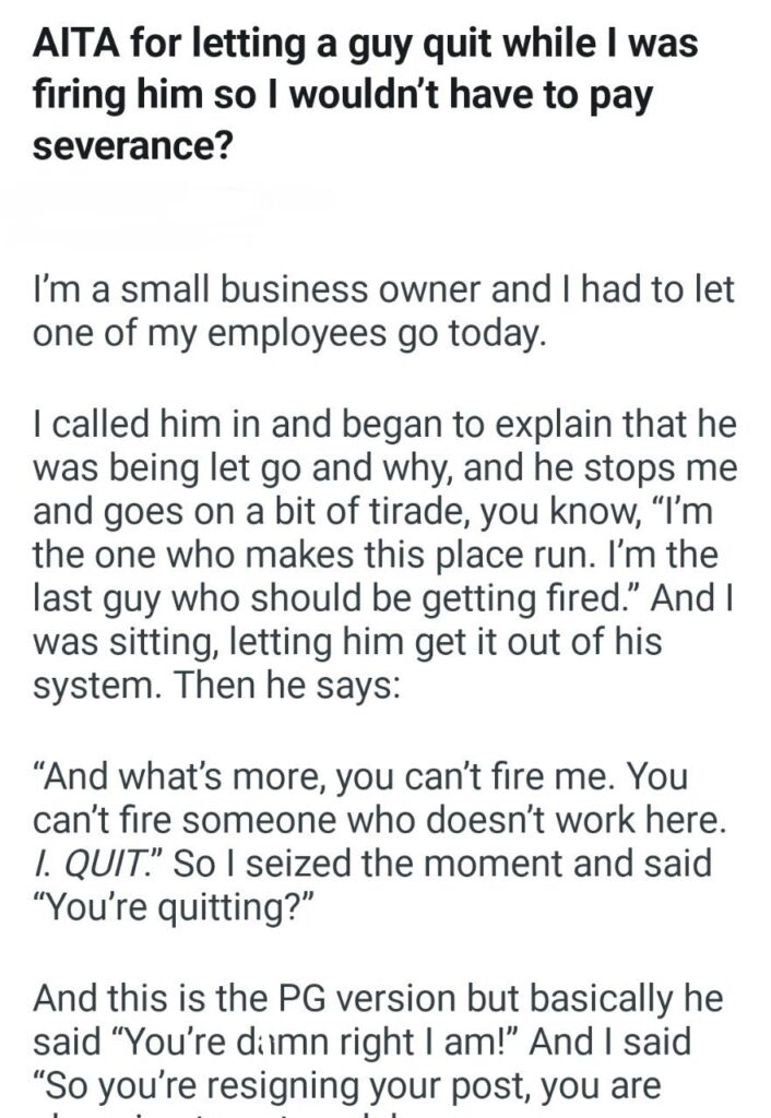 The narrator is a small business owner who had the unfortunate task of firing an employee. It is never a fun day. He called the guy in and started the standard speech. He was explaining that the employee was being let go and trying to get through the “why” of it all. Usually, this is where you hand over the paperwork, discuss the severance, and shake hands awkwardly.